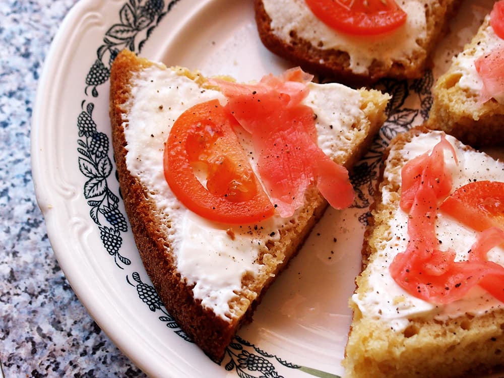 Каждый ломтик хлеба намазать плавленным сыром. Сверху положить по ломтику помидора и маринованный имбирь. Сверху посыпать солью и черным молотым перцем.