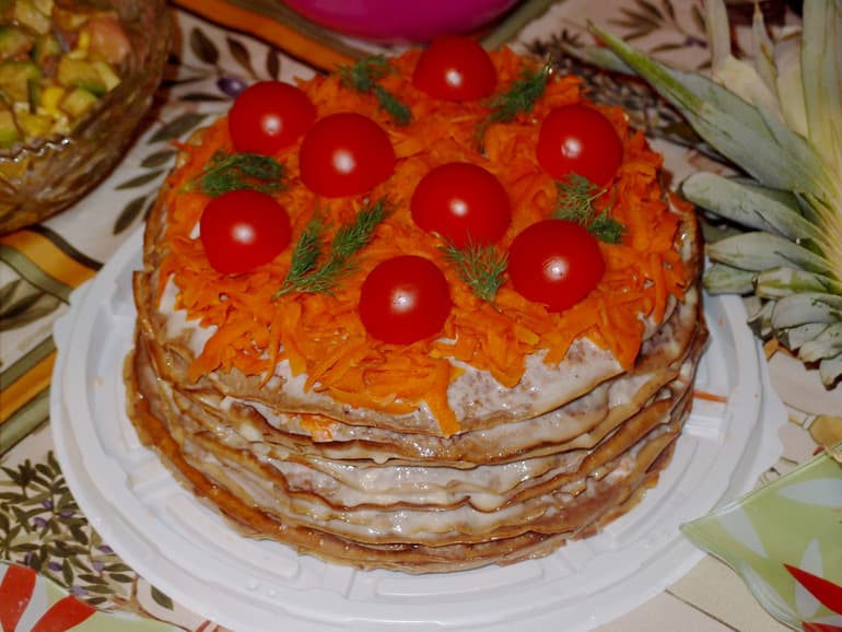 Морковку отварить и натереть на крупную терку. То же самое проделать с плавленным сырком. Чеснок измельчить и добавить в майонез и хорошо размешать. Каждый блин смазываем чесночным майонезом и выкладываем начинку. Украшаем по желанию. В этот раз я украсила помидорками черри и укропом.