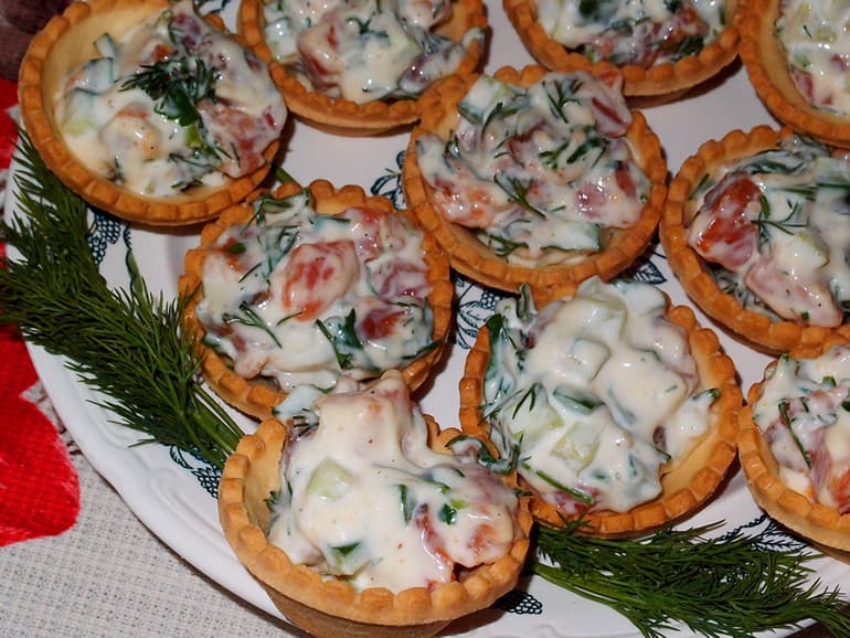 Плавленный сыр смешать с майонезом до образования сметанной консистенции. Красную рыбу и огурцы нарезать кубиками. Зелень — измельчить. Смешать все ингредиенты и этой смесью наполнить тарталетки.