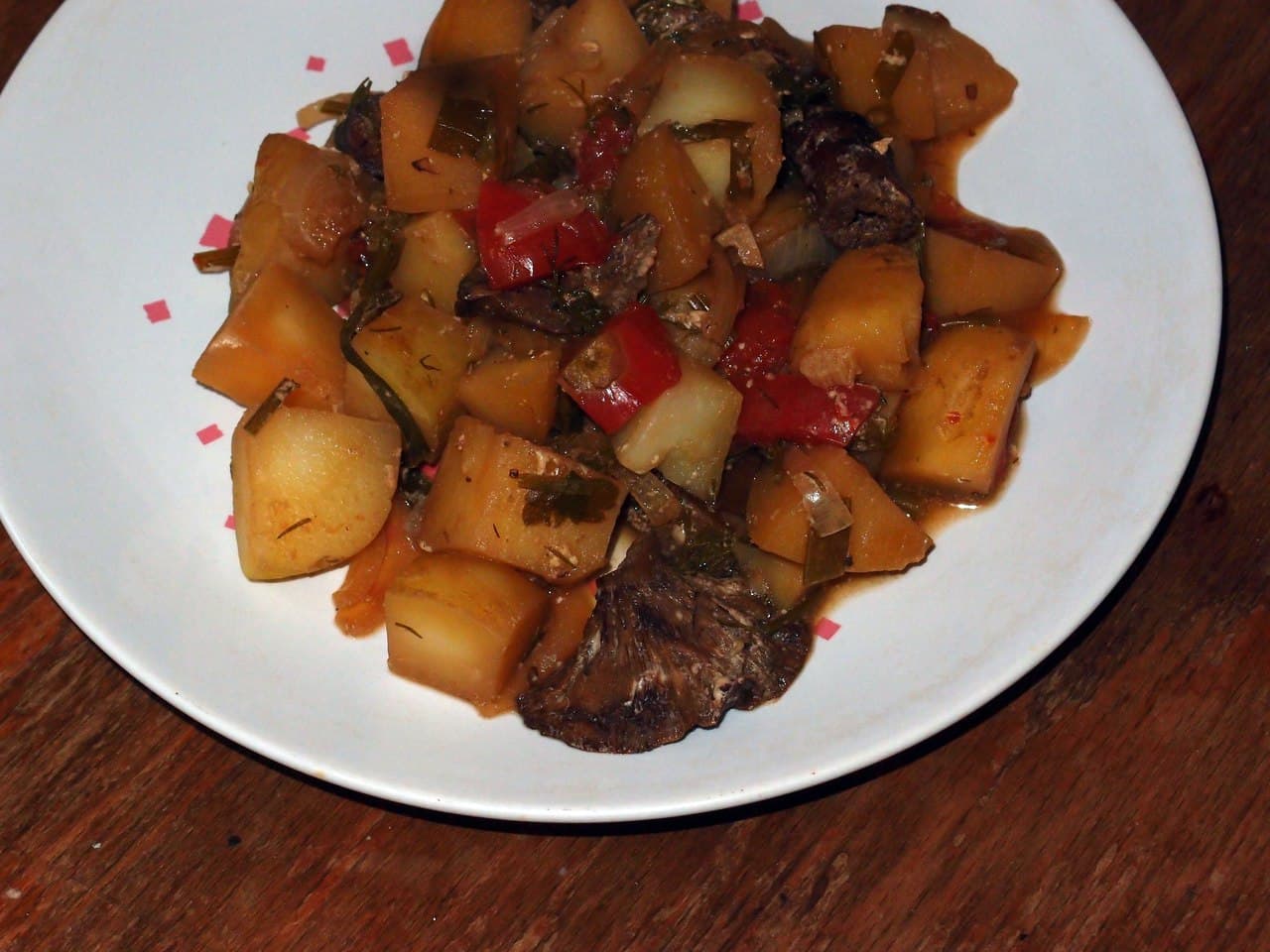 Картофель режем кубиками, крупные рыжики — на половинки. Складываем в чашу мультиварки. Добавляем морковь, нарезанную дольками, помидоры — кубиками, измельченную зелень, черный молотый перец и соевый соус. Добавляем 1/2 стакана воды. Перемешиваем.