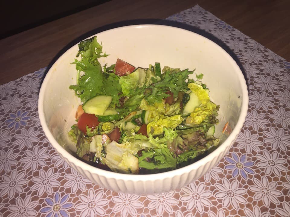 Огурцы и помидоры режем и добавляем салатную смесь. Заправляем соевым соусом и оливковым маслом.