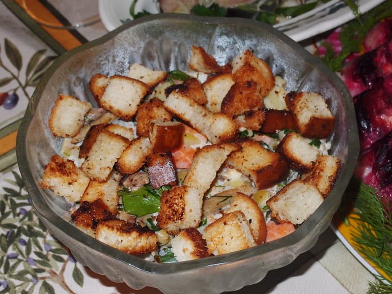 Яйца и морковь отварить. Яйца, огурцы и морковь нарезать кубиками. Лук — измельчить. Шпроты порезать средними кусочками, предварительно слив масло. Смешиваем все ингредиенты и заправляем майонезом. Из ломтиков батона приготовить сухарики и посыпать салат перед подачей.