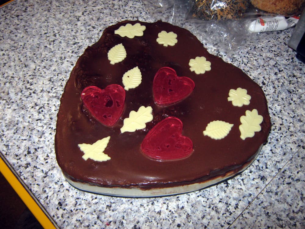 Приготовить желе согласно инструкции на упаковке. Через час достать торт из холодильника и залить желе. Отправить торт в холодильник на 4-5 часов.
