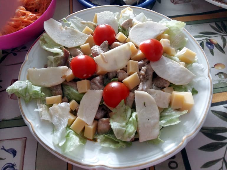 Листья салат рвем на небольшие кусочки и выкладываем на плоскую тарелку. Майонез смешиваем с соком половины апельсина и поливаем салат. Сверху выкладываем жареное куриное филе и кубики сыра. Снова немного заправки. Сверху выкладываем тоненькие ломтики яблока и поливаем соком от второй половинки апельсина. Посыпаем сухариками