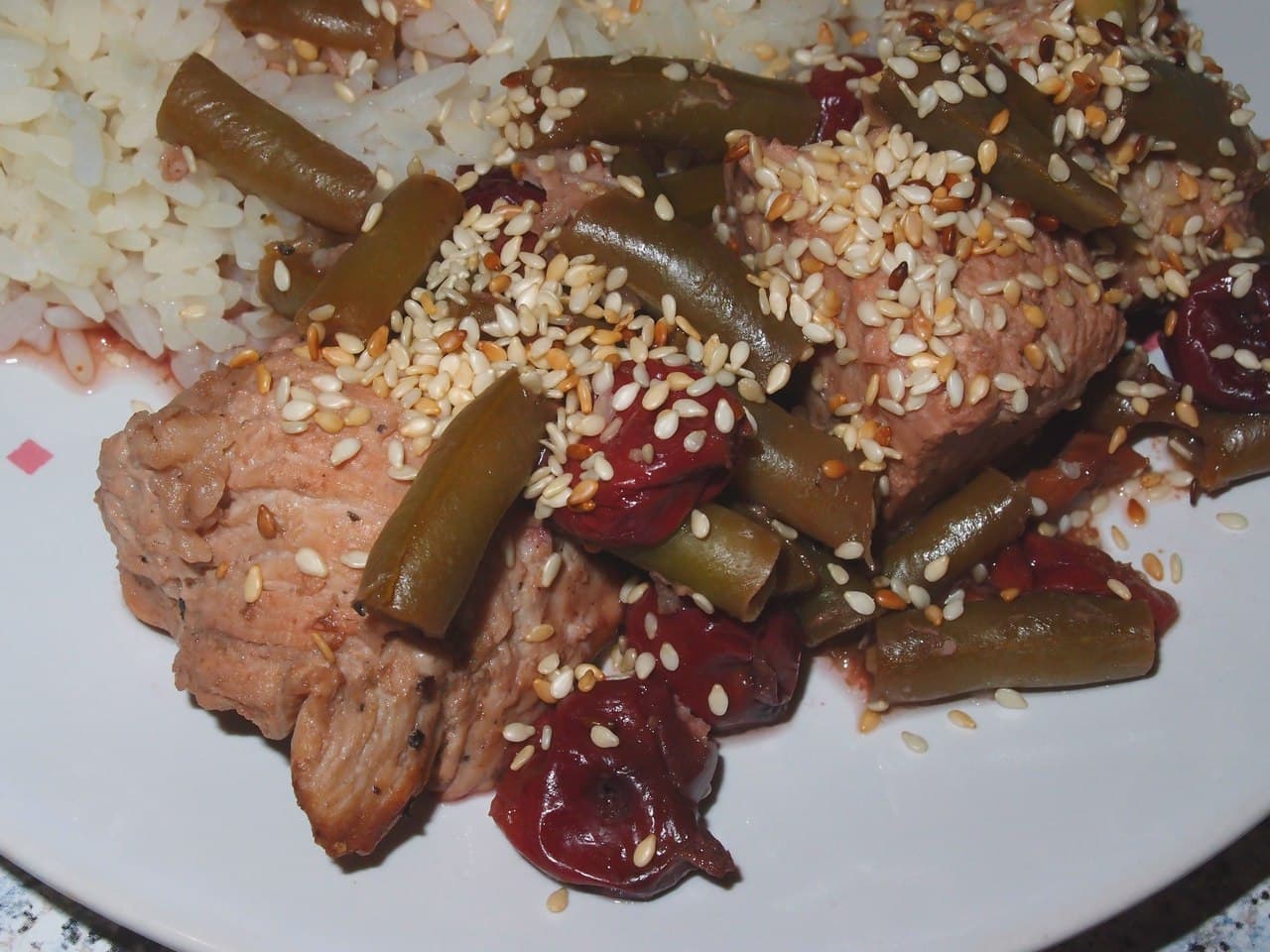 Индейку режем на порционные кусочки и складываем в форму для запекания. Стручковую фасоль варим до полуготовности, просыхаем и добавляем к индейке. Туда же отправляем вишню. Добавляем соевый соус и черный молотый перец. Перемешиваем и добавляем воду, чтобы почти полностью покрывало ингредиенты. Кладем пару веточек свежего розмарина.