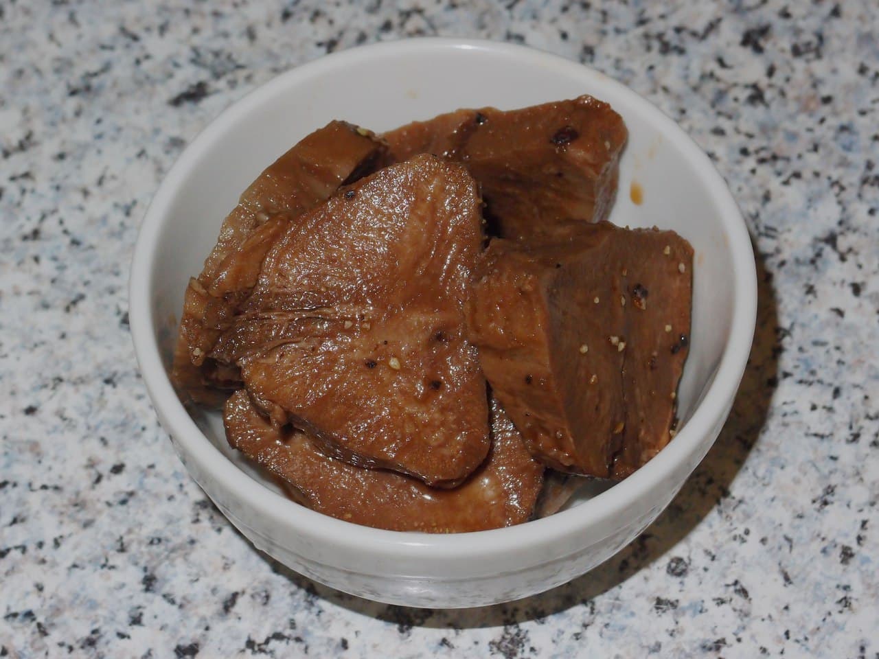 Язык отварить, почистить, порезать ломтиками, добавить чеснок колечками, перец и соевый соус. Сложить в чашу маринатора, запустить на 2-3 цикла. А еще лучше после оставить в маринаторе на 30 минут. Так будет вкуснее.