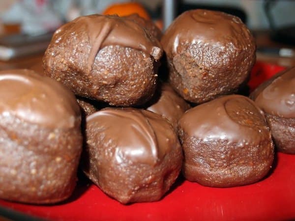 Сперва нужно перемолоть сухари на мясорубке в мелкую крошку. В отдельной миске перемешиваем банку сгущённого молока с какао-порошком. Перетираем до исчезновения комочков, добавляем сливочное масло, порезанное на кусочки и ставим на маленький огонь (пока масло не растает). Далее растапливаем плитку шоколада. Из шоколадной массы добавляем к шоколадно-масляному крему половину, т.е. 50 грамм, а остальное пойдёт на украшение. В конце подмешиваем в шоколадный крем две столовые ложки коньяка (для аромата). Теперь смешиваем сухарную крошку и шоколадный крем. В результате получится шоколадная крошка. Если «тесто» получится сухим, добавляем в него немного сгущенки или молока, если жидким — крошки сухарей. Разделяем массу на 20 частей и лепим шарики. Готовые шарики обмакиваем в шоколад и по желанию украшаем орехами или цукатами. Ставим в холодильник на пару часов. Готово :=)