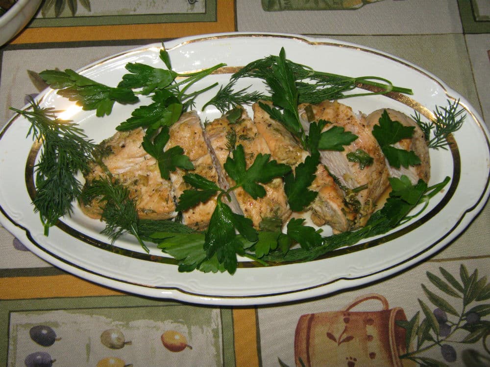 Куриное филе посыпать молотым черным перцем. С лайма снять цедру и измельчить. Из лайма выдавить сок. Имбирь почистить и натереть на мелкой терке. Смешать цедру, сок и имбирь, добавить соевый соус. Полить филе. Добавить немного воды. Оставить мариноваться на 40 минут. Духовку разогреть до 180 градусов. Куриное филе в маринаде переложить в форму для запекания добавить, чтобы куриное филе до середины покрыто водой. Выпекать 30-35 минут. Перед подачей украсить зеленью.