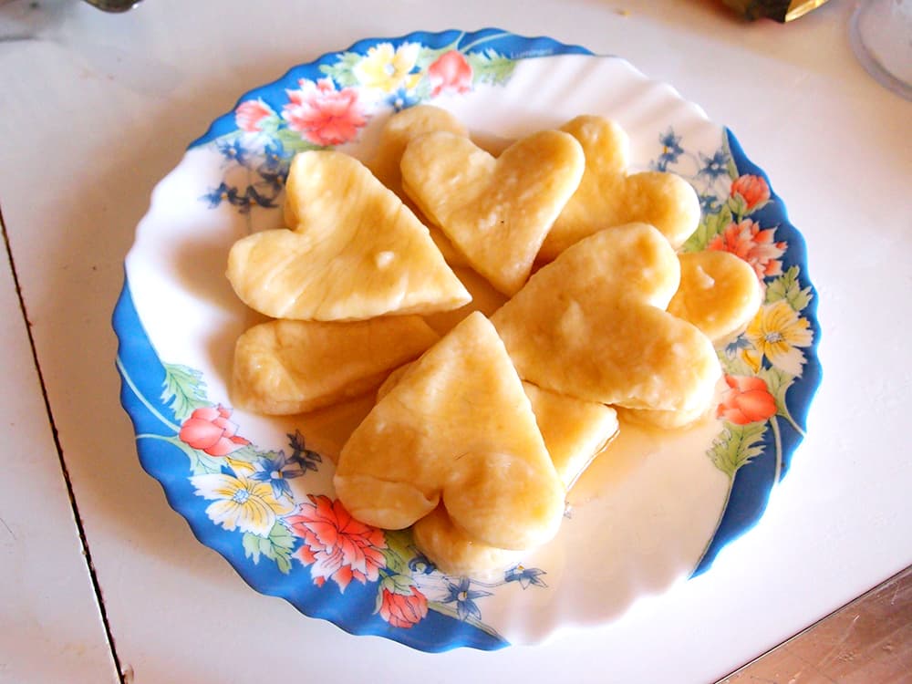 Тесто раскатать или размять руками и формочками вырезать сердечки.