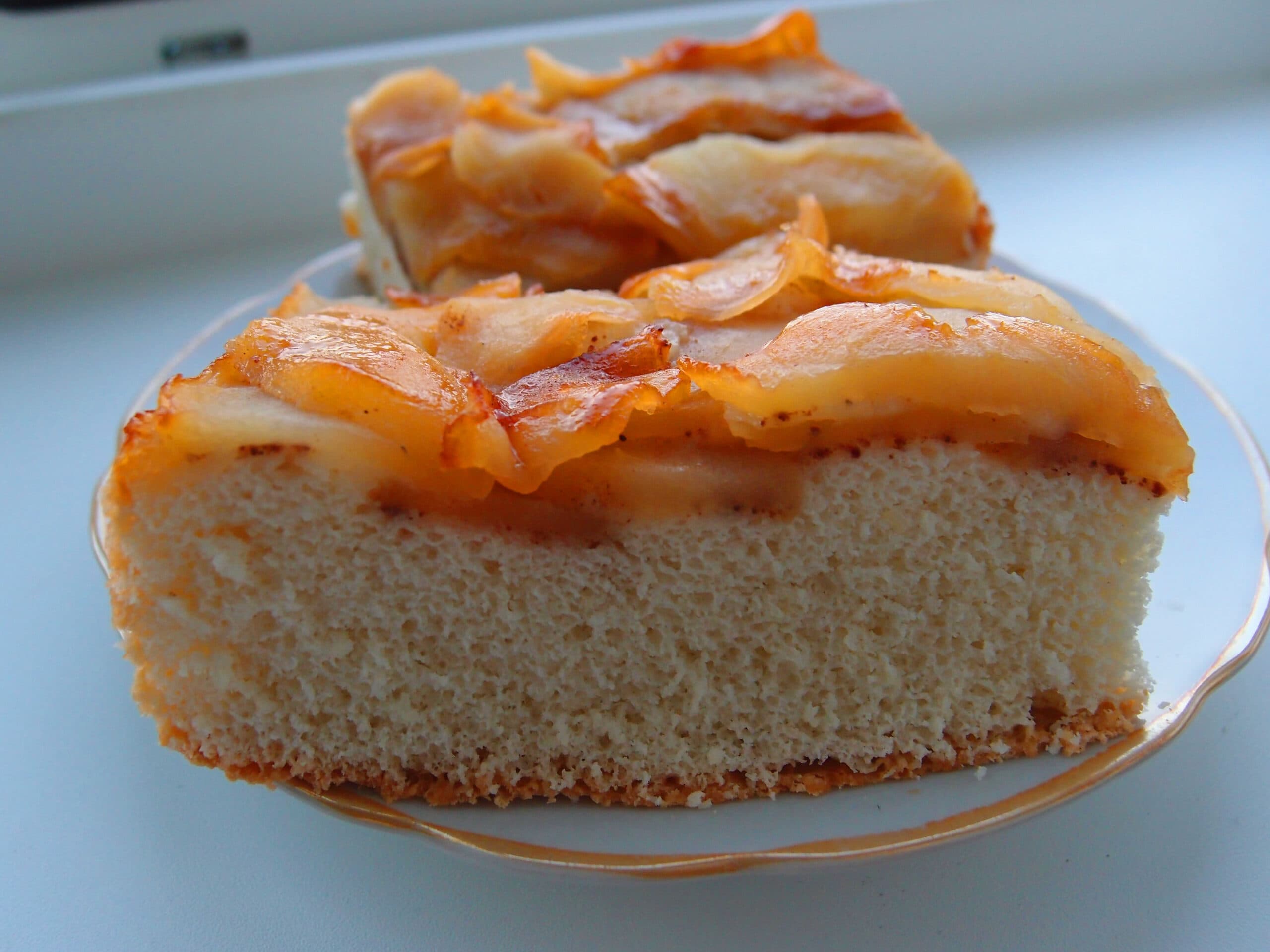 В миску для замешивания выливаем желтки и выкладываем взбитые белки, и за три приема, непрерывно и медленно перемешивая, всыпаем муку. Яблоки заливаем тестом и ставим в разогретую духовку.Выпекаем на протяжении 40 минут при температуре 170-180 градусов.