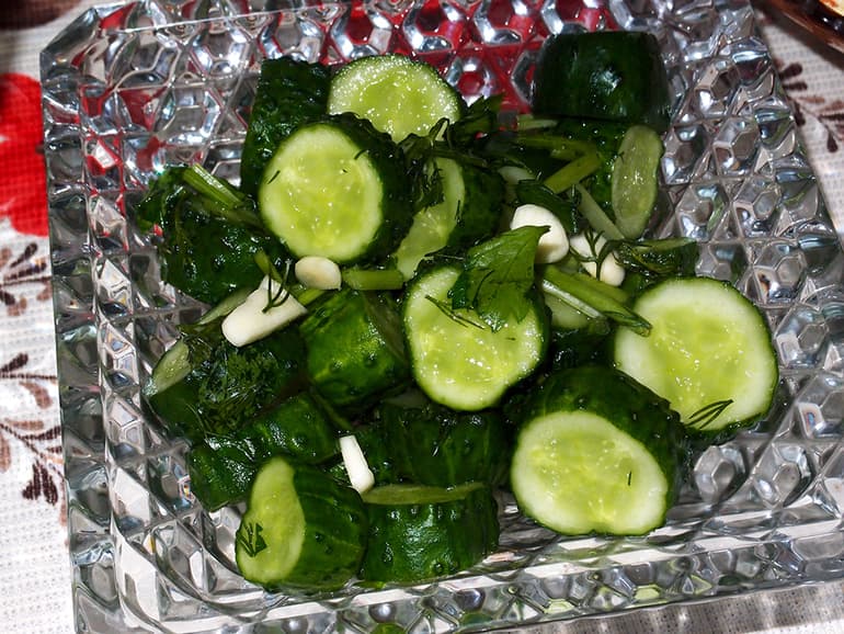 Огурцы нарезать кольцами толщиной 1,5 см. Чеснок, укроп и петрушку измельчить. Добавить к огурцам соль, сахар, зелень и чеснок. Перемешать. Переложить в сухой пакет и туго завязать. Мариновать на холоде 2 дня.