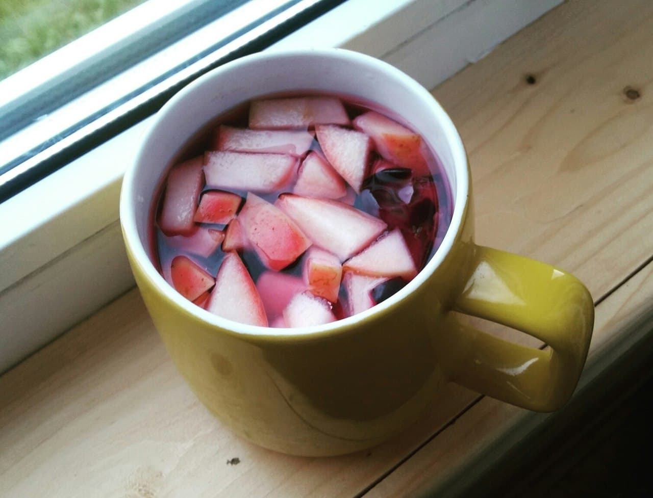 Ягоды смешать с сахаром и растереть ступкой. Добавить яблоки, залить кипятком, размешать и дать настояться 10 минут.