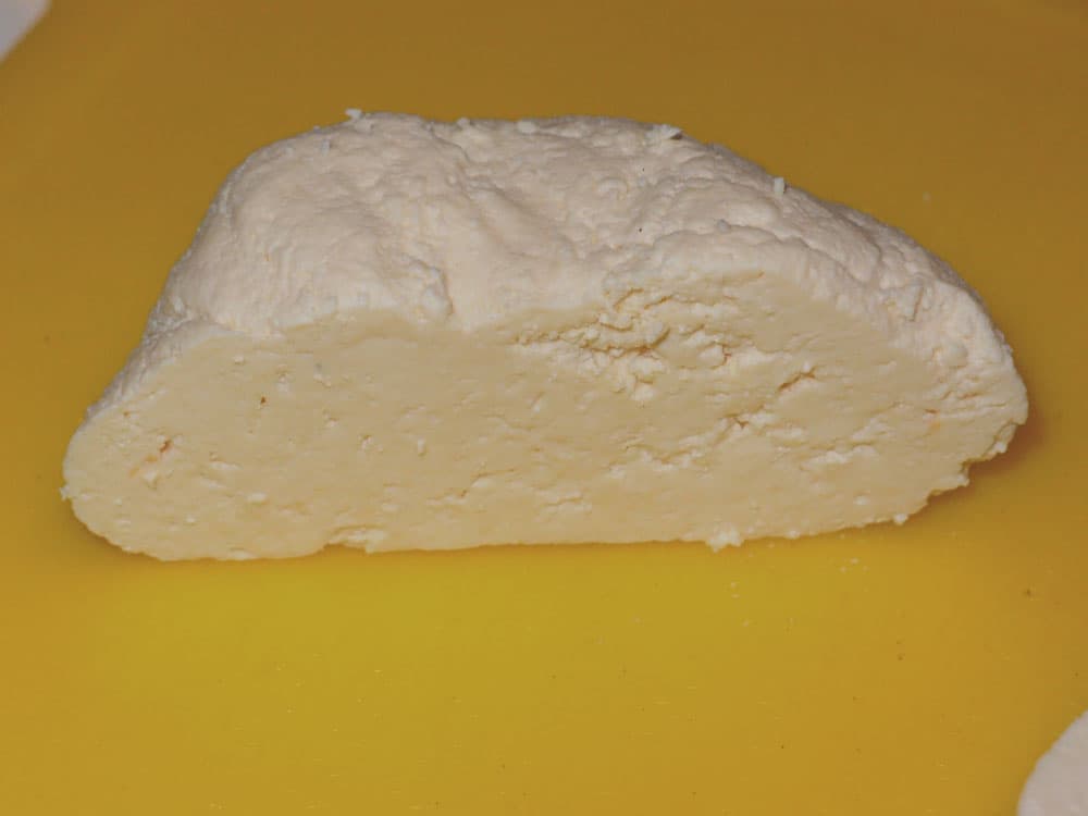 Смесь выливаем в дуршлаг, чтобы основная часть сыворотки стекла. Потом перекладываем в марлю, сложенную в 4 слоя. Отжимаем, ставим на пару часов под гнет (я положила в дуршлаг, накрыла тарелкой и поставила сверху поллитровую баночку с томатной пастой) и оставляем на часик, что стекли остатки сыворотки. Затем перекладываем в тарелку, оставляем гнет и ставим в холодильник на 4 часа. Готового сыра у меня получилось 350 грамм.