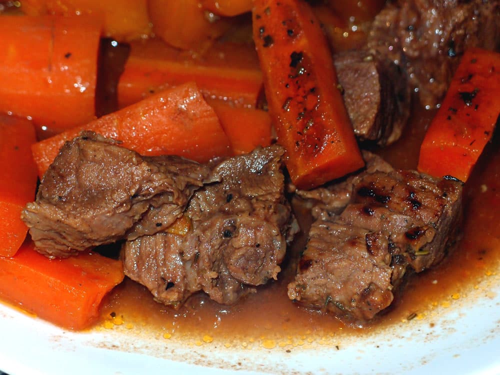Говядину режем на средние кусочки, морковку чистим и режем брусочками. Добавляем черный молотый перец и французские травы. Смешиваем и выкладываем в горшочек. Добавляем соевый соус. В стакане воды размешиваем томатную пасту и выливаем в горшочек. Доливаем воды, чтобы вода почти покрывала мясо с морковью. Накрываем горшочек крышкой.