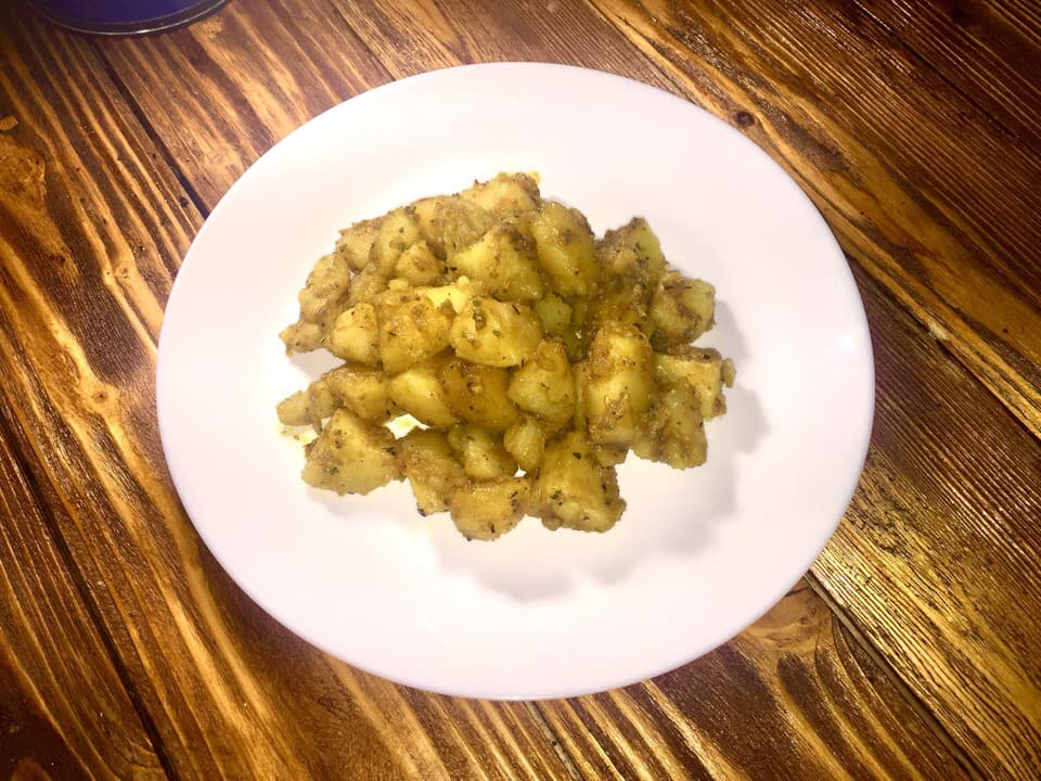 Отварной картофель нарезать кубиками, выложить в чашу мультиварки, смазанную маслом. Добавить специи и немного полить соевым соусом. Обжаривать до румяной корочки и раскрытия специй.