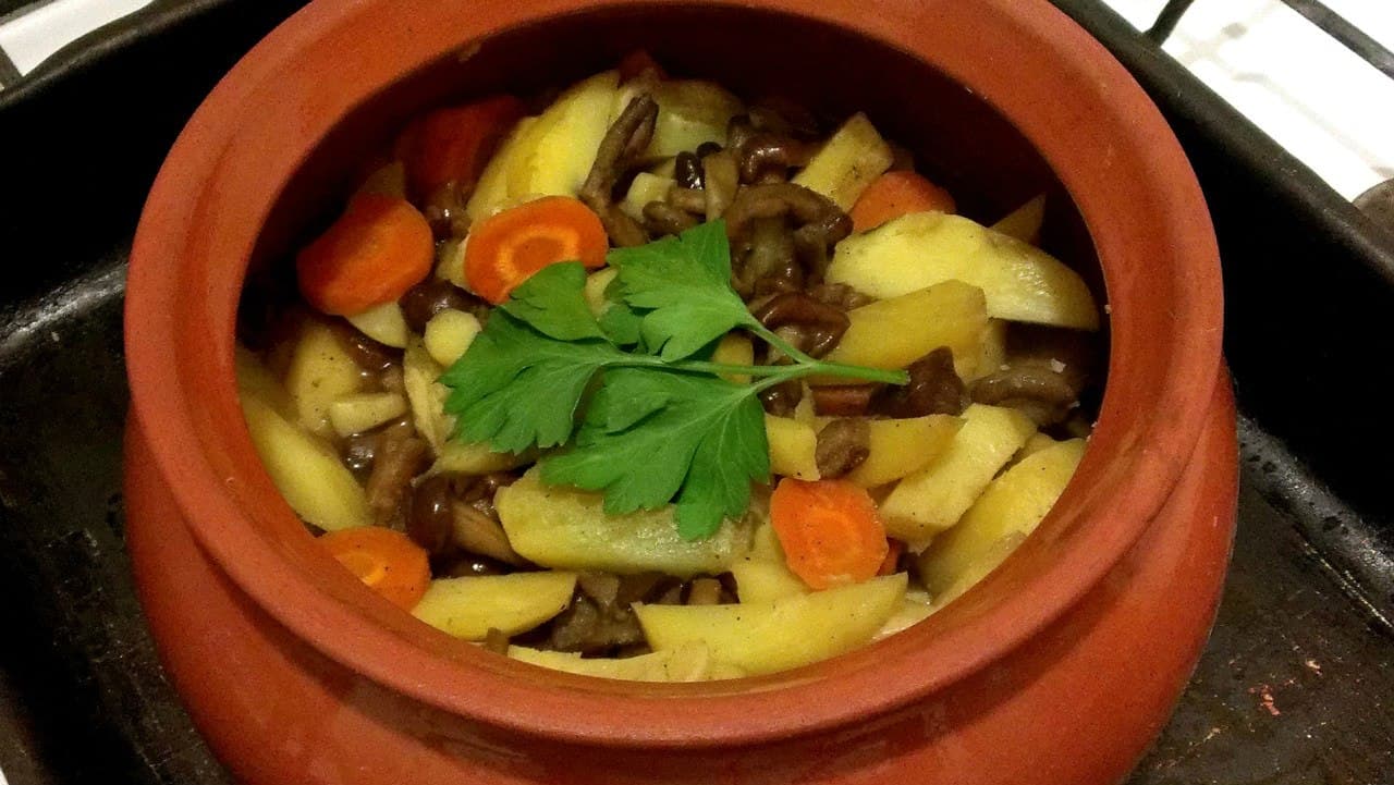 Картофель чистим и режем кубиками или брусочками. Опята промываем теплой водой, чтобы смыть лед, и добавляем к картошке. Морковь режем колечками и добавляем к картошке с грибами. Солим перчим. Все складываем в горшочек. Наливаем воды, чтобы было чуть большем, чем на половину.
