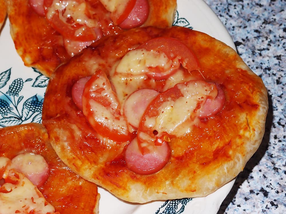 Форму для выпечки смазать растительным маслом. Тесто разделить на 6 частей и слепить маленькие лепешки. Смазать томатной пастой. Первым слоем выложить сосиски, сверху положить помидоры. Посыпаем тертым сыром.