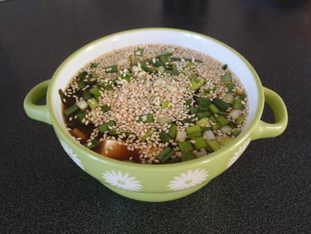 Наливаем в тарелки, добавляем соевый соус, зеленый лук и кунжут.
