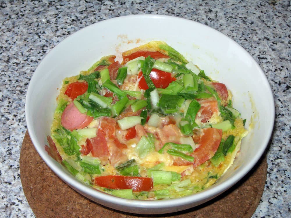 Яйцв взбить с солью, перцем, молоком и мукой, чтобы не было комочков. Добавить сосиску, нарезанную колечками, помидор — дольками и измельченный зеленый лук или другую зелень. Размешать. Выложить все в глубокую тарелочку и поставить в микроволновку. Готовить 7 минут при мощности 700 Ватт.