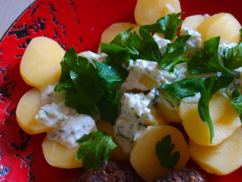 Огурец трем на крупную терку, а петрушку измельчаем на маленькие веточки. Смешиваем с йогуртом и солим по вкусу. Поливаем этим соусом картофель и при желании украшаем зеленью.