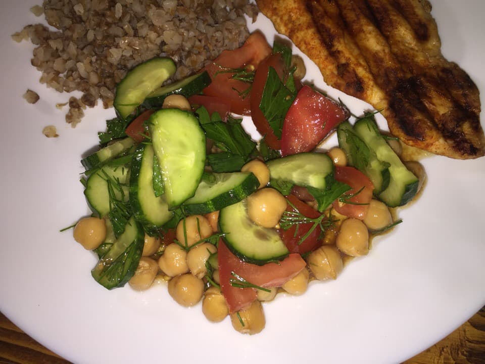 Огурцы, помидоры и зелень порезать. Добавить нут, заправить оливковым маслом и соевым соусом, перемешать.