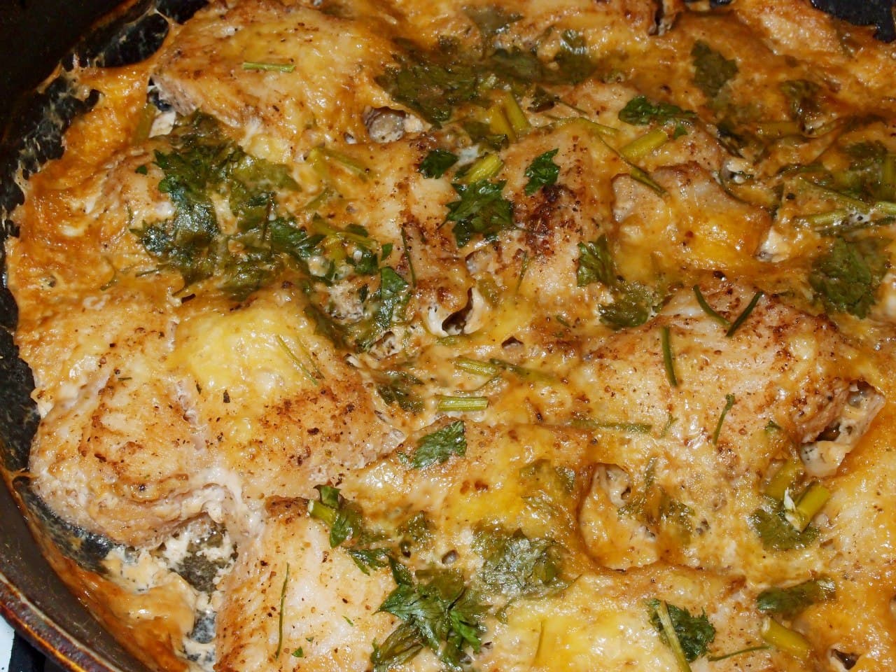Филе пангасиуса режем на кусочки. Выкладываем в форму для запекания и посыпаем чесночным перцем. В молоко добавляем щепотку соли, сыр и измельченную зелень, размешиваем и заливаем рыбу. Молоко должно почти покрывать кусочки филе.