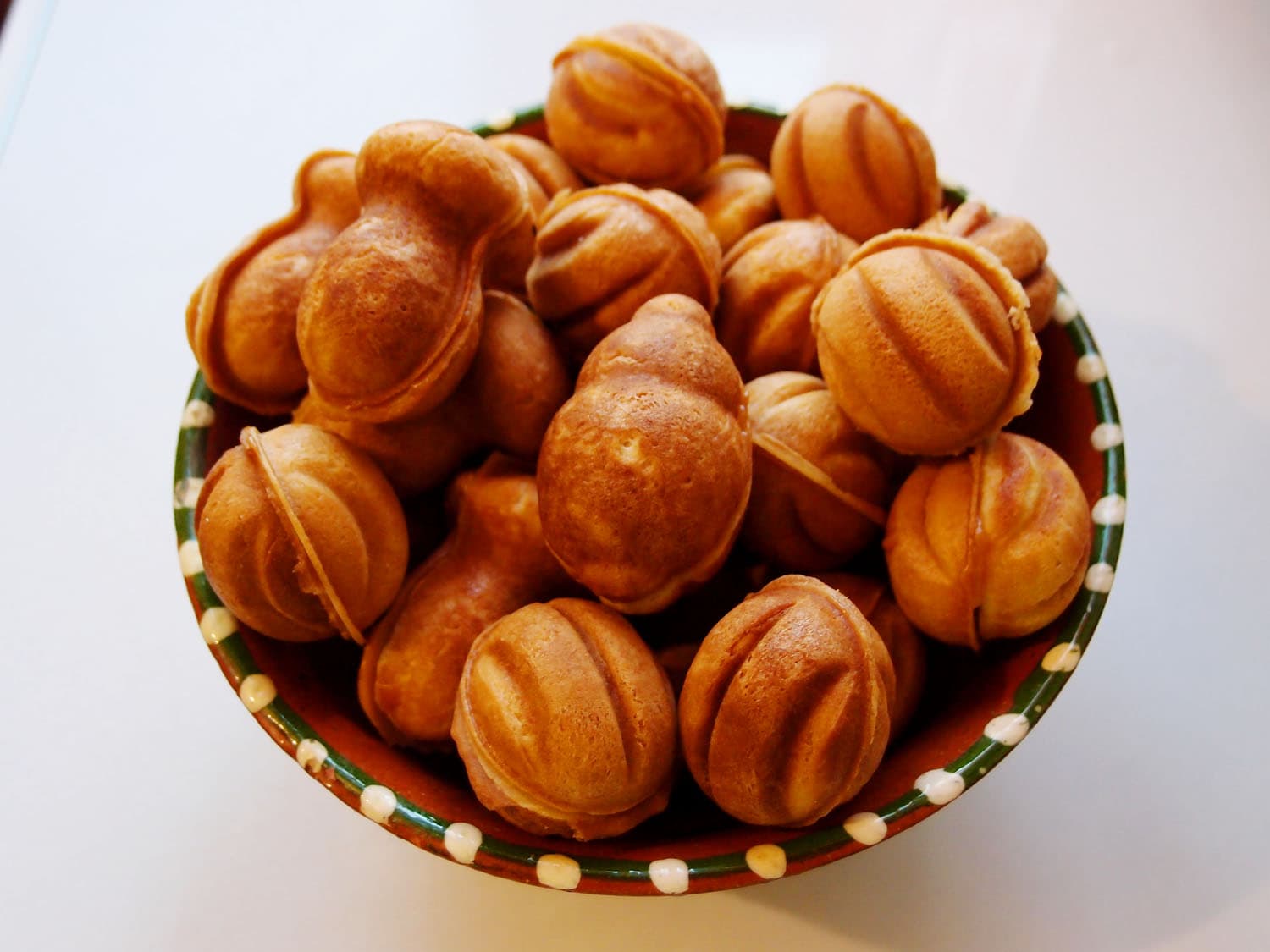 Форму для выпечки орешков хорошо смазать растительным маслом и прогреть на плите, чтоб печенье не приставало к форме. Слепить маленькие шарики и выложить в форму. Закрыть форму и жарить на среднем огне 3-4 минуты. Выложить печенье из формы и дальше, не смазывая растительным масло, жарить остальное печенье.