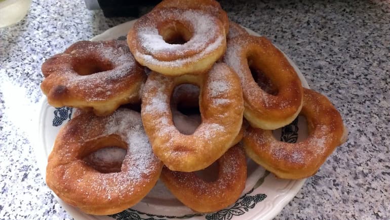 В сковородку налить масло и обжаривать пончики до румяной корочки. Готовые пончики выложить на бумажное полотенце, чтобы убрать излишки масла, переложить на тарелку и посыпать сахарной пудрой.