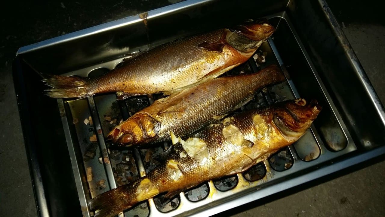 В мангале разжигаем уголь. Щепу на минут 15 заливаем водой, а затем отжимаем. На дно коптильни выкладываем щепу, а на решетку — рыбу. Закрываем коптильню оставим на мангал. Коптим до готовности. В зависимости от размера рыбы и силы огня время приготовления от 20 до 50 минут.