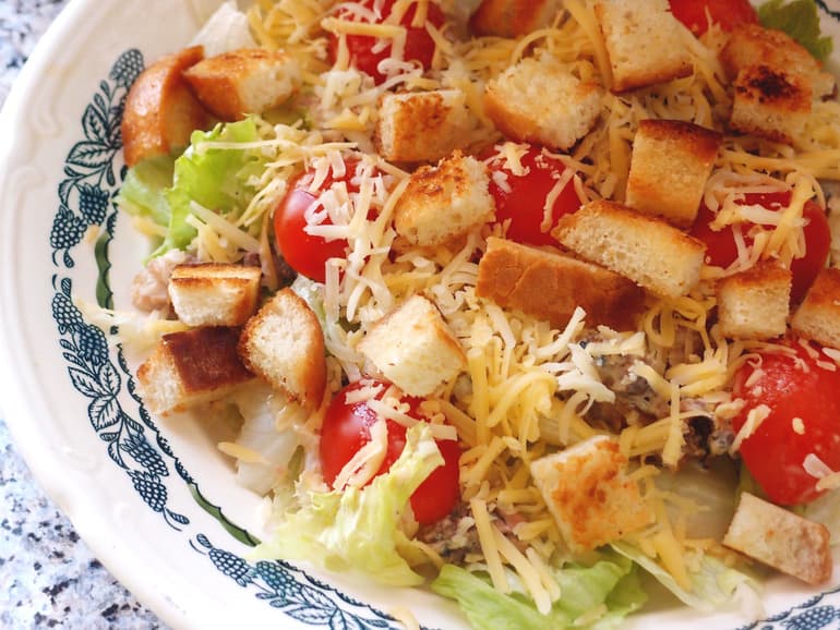 Батон режем кубиками. В растительное масло добавляем измельченный чеснок и оставляем настаиваться. Это лучше всего сделать в начале приготовления, чтобы масло получило аромат и вкус чеснока. Когда масло настоится, добавляем его на сковородку (следим, чтобы на сковородку не попал чеснок). Разогреваем и выкладываем нарезанный хлеб. Обжариваем сухарики до румяного цвета.