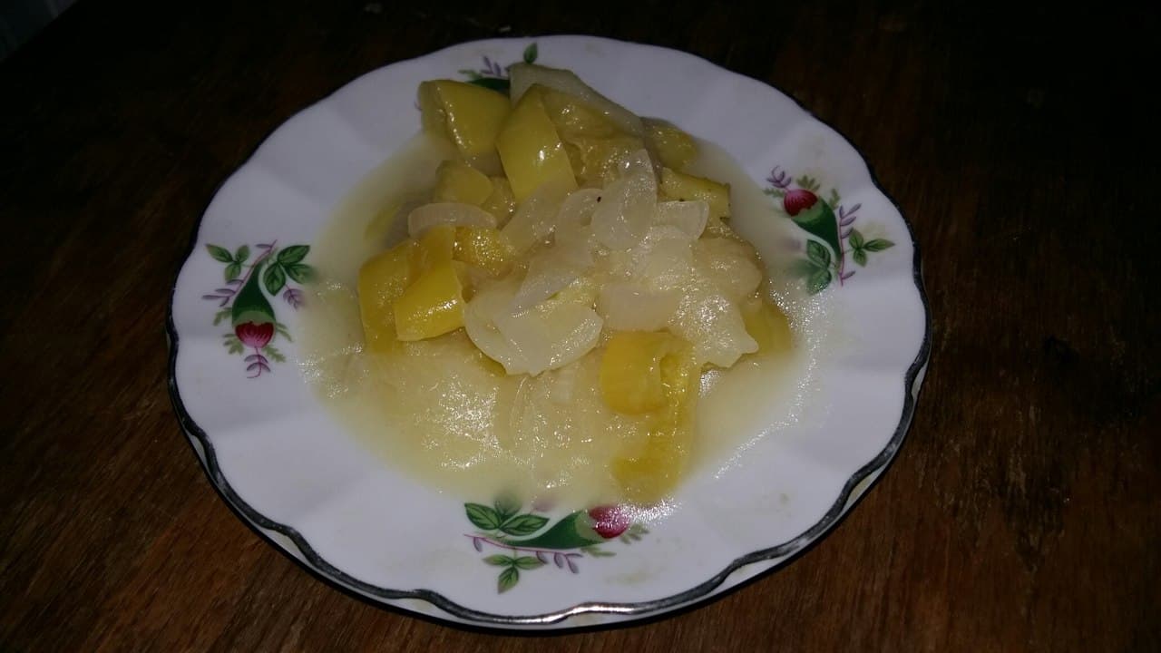 Болгарский перец режем соломкой, яблоки — дольками, лук — полукольцами.