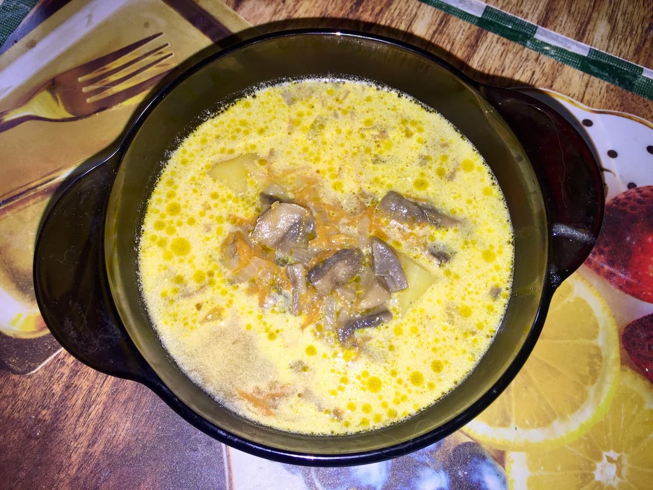 Лук мелко нарезать и притомить на растительном масла, добавить грибы и уксус. Обжарить 2-3 минуты, добавить 3 ст.л. соевого соуса и немного воды. Тушить 15 минут. Через 5 минут добавить морковь, натертую на крупной терке, и сушеный базилик. Картофель почистить и нарезать кубиками. Добавить к грибам, перемешать и тушить еще 5 минут. Залить горячей водой до нужной консистенции. Варим до готовности картофеля. В конце добавляем плавленные сырки, натертые на мелкой терке. На слабом огне помешивать суп до растворения сырков. Добавить по вкусу соевый соус и посолить. Оставить настояться минут 10.