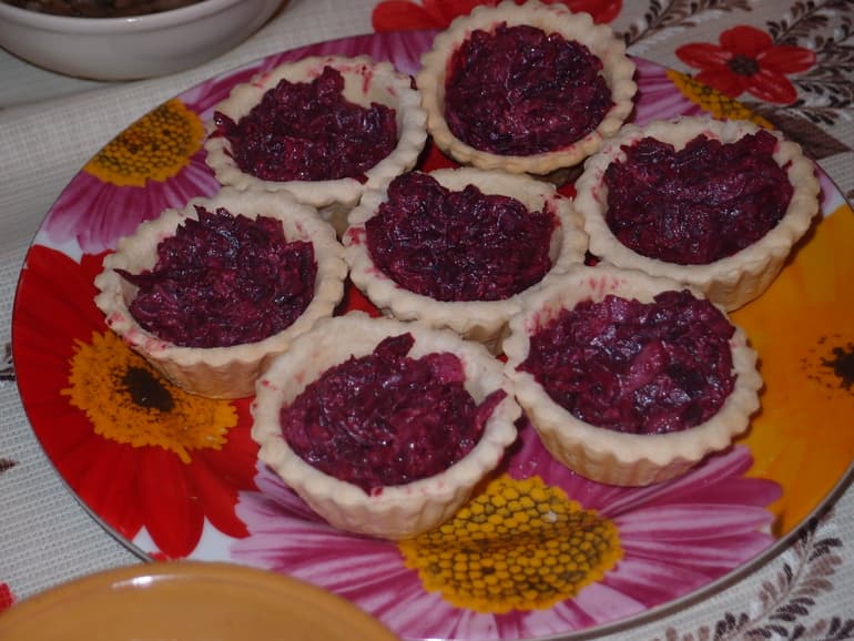Свеклу отварить и натереть на крупную терку, добавить нарезанную селедку и заправить майонезом. Выложить в тарталетки.