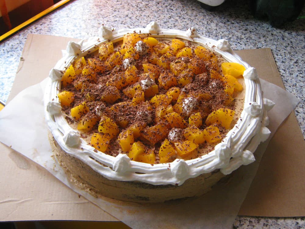 Сверху и по бокам обмазать кремом. Украсить белковым кремом, консервированными персиками и тертым шоколадом.