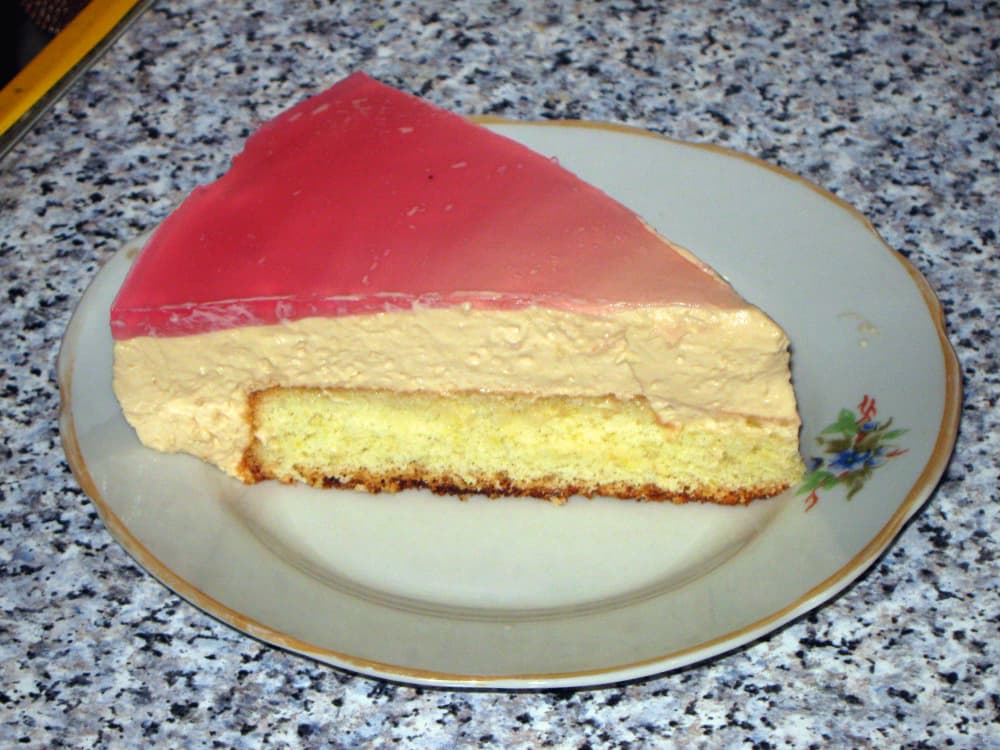 Приготовить желе согласно инструкции на упаковке. Через час достать торт из холодильника и залить желе. Отправить торт в холодильник на 4-5 часов.