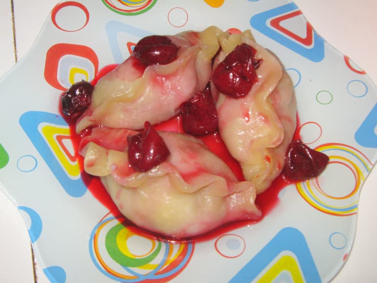 Тесто раскатываем, стаканом вырезаем кружочки. В центр каждой лепешки выкладываем ягодки вишни и защипываем края, формируя вареник. Готовые вареники варим на пару 7 минут. Перед подачей поливаем вишневым соком или сиропом и украшаем ягодами.