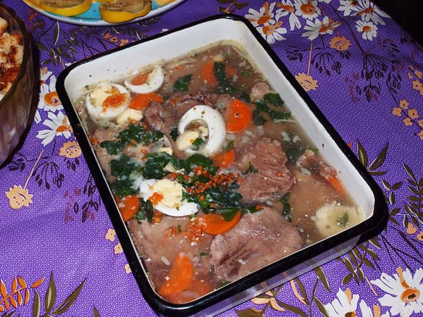 Варим язык со специями до готовности. Разводим в бульоне смесь согласно инструкции на пакетике. В форму выкладываем язык, украшаем вареной морковью, яйцом, колечками лимона, зеленью, добавляем чеснок. Заливаем бульоном с желатиновой смесью и ставим на холод застывать.